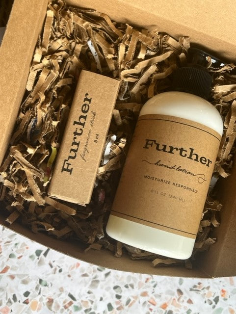 Mom, Dad, Grad, Friend, New Neighbor or Just Because…our classic duo of the Further Fragrance Stick & 8oz Lotion is the perfect gift for anyone on your list. Wrapped in a classic kraft box and simple ribbon, our gift boxes also include an insert – one side has your personal note (be sure to include at check out) and the back has the Further Story so your recipient knows just how special and unique their gift truly is.